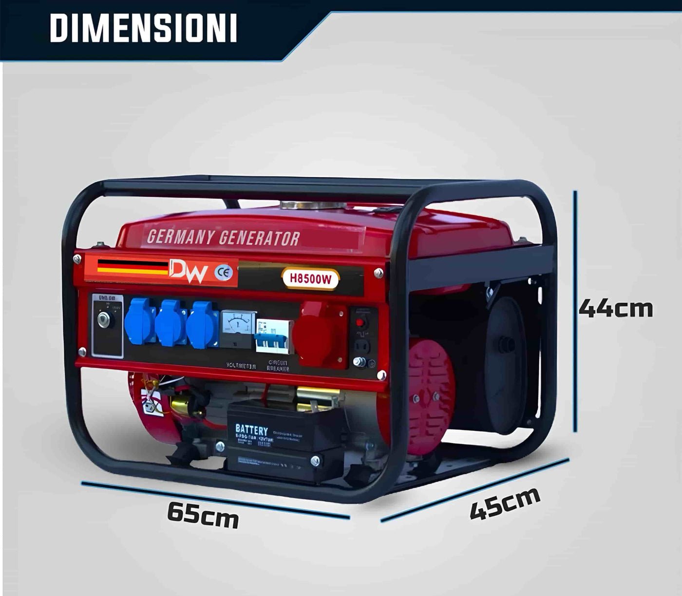 Le dimensioni del generatore sono 65 cm di larghezza, 44 cm di altezza e 45 cm di profondità. 40 kg